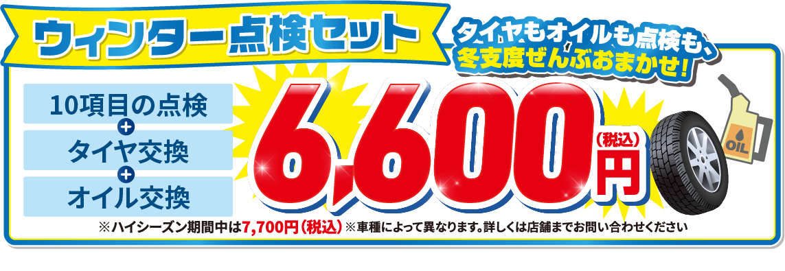 10項目の点検に加え、タイヤ交換+オイル交換がセットで6,600円(税込)